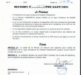Quelques heures après la décision de la Ligue Guinéenne de Football Professionnel (LGFP) suspendant le stade de la Mission jusqu’à...