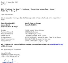 Éliminatoires Mondial 2022 : un quatuor guinéen désigné pour le match Togo-Congo