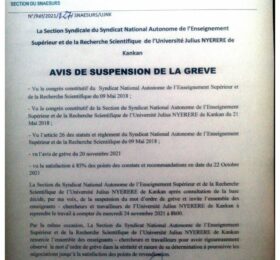 Les cours reprendront ce mercredi, 24 novembre prochain. Dans un avis-dont copie a été transmise à Mediaguinee- la section du Syndicat...