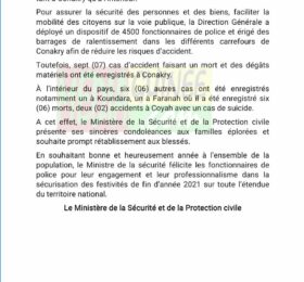 Dans un communiqué dont copie à été transmise à Mediaguinee ce samedi 1er janvier 2022, le Ministère de la Sécurité et de la...