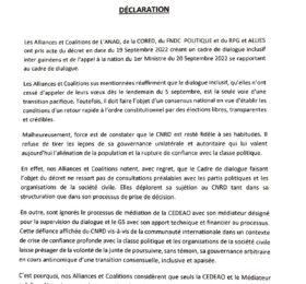 Vers un nouveau blocage du cadre de dialogue. Dans une déclaration dont copie a été transmise à Mediaguinee, les Alliances et...
