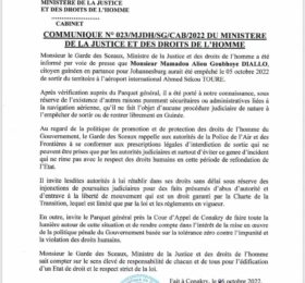 Dans un communiqué dont Mediaguinee détient copie, le ministre de la Justice Alphonse Charles Wright a informé que Mamadou Aliou...