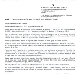 LE CAIRE- La Fédération Guinéenne de Football informe le public et les supporters du Syli National que le Jury Disciplinaire de la CAF...