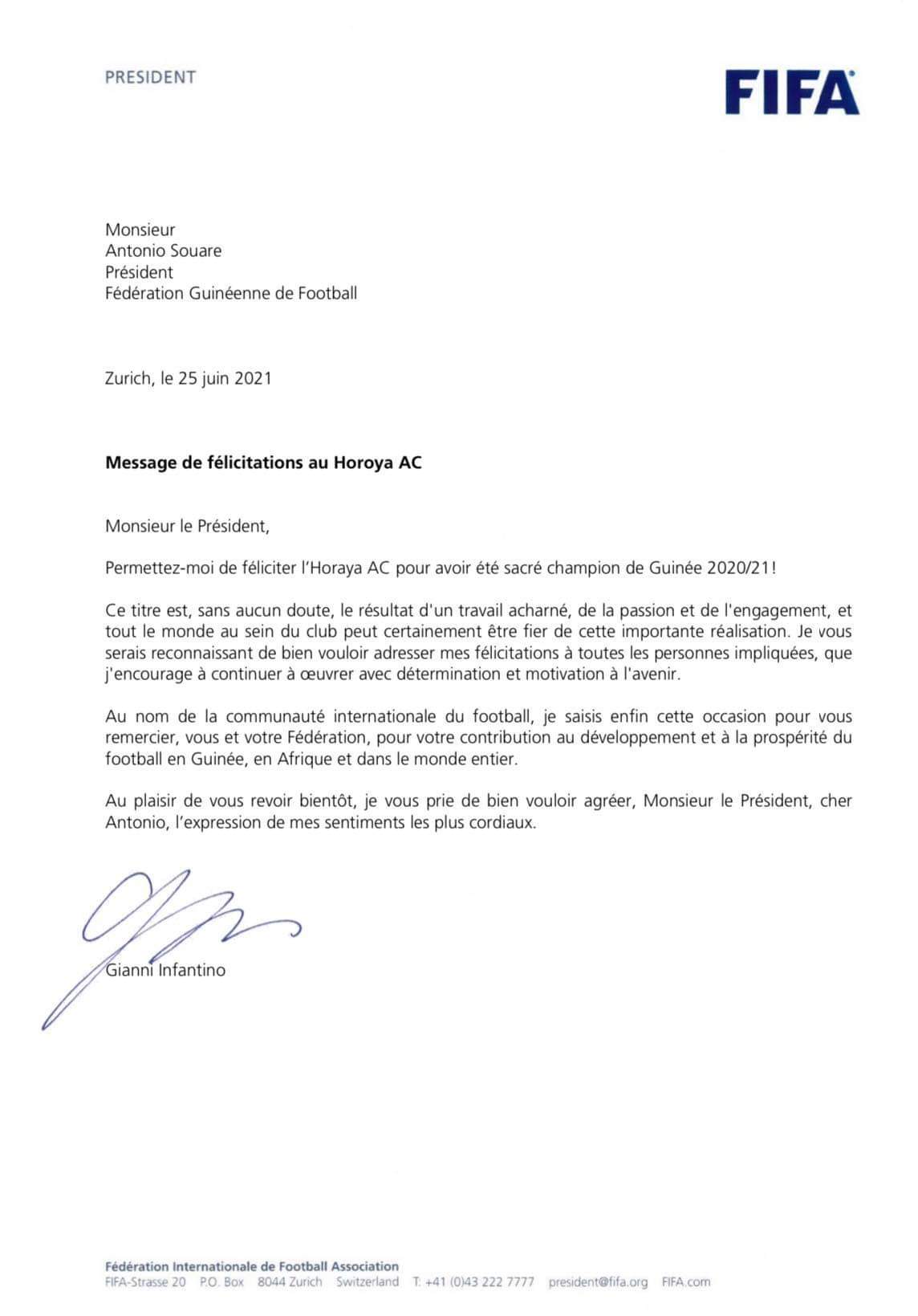 Ce sacre du club de Matam est la preuve éloquente que le propriétaire Antonio Souaré, par ailleurs président de la fédération guinéenne de Football, est impliqué sans relâche pour le développement du football guinéen en particulier, et celui de l’Afrique en général. Cette performance du Horoya AC est saluée et appréciée à juste titre par la FIFA. A travers son secrétaire général, Gianni Infantino, l’instance de gestion du football mondial a adressé un courrier de félicitations au nouveau champion de Guinée.