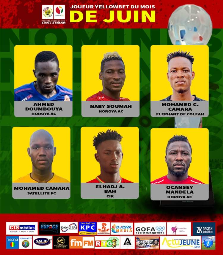 CONAKRY– Le samedi 10 juillet prochain, Guineefoot.info et Sportsguineens decerneront le dernier trophée du joueur Yellowbet du mois en Ligue 1. Cette cérémonie, la huitième de cette saison 2020-2021, aura lieu au centre technique de Nongo, à Conakry. Ils sont six (6) joueurs nominés cette fois-ci.