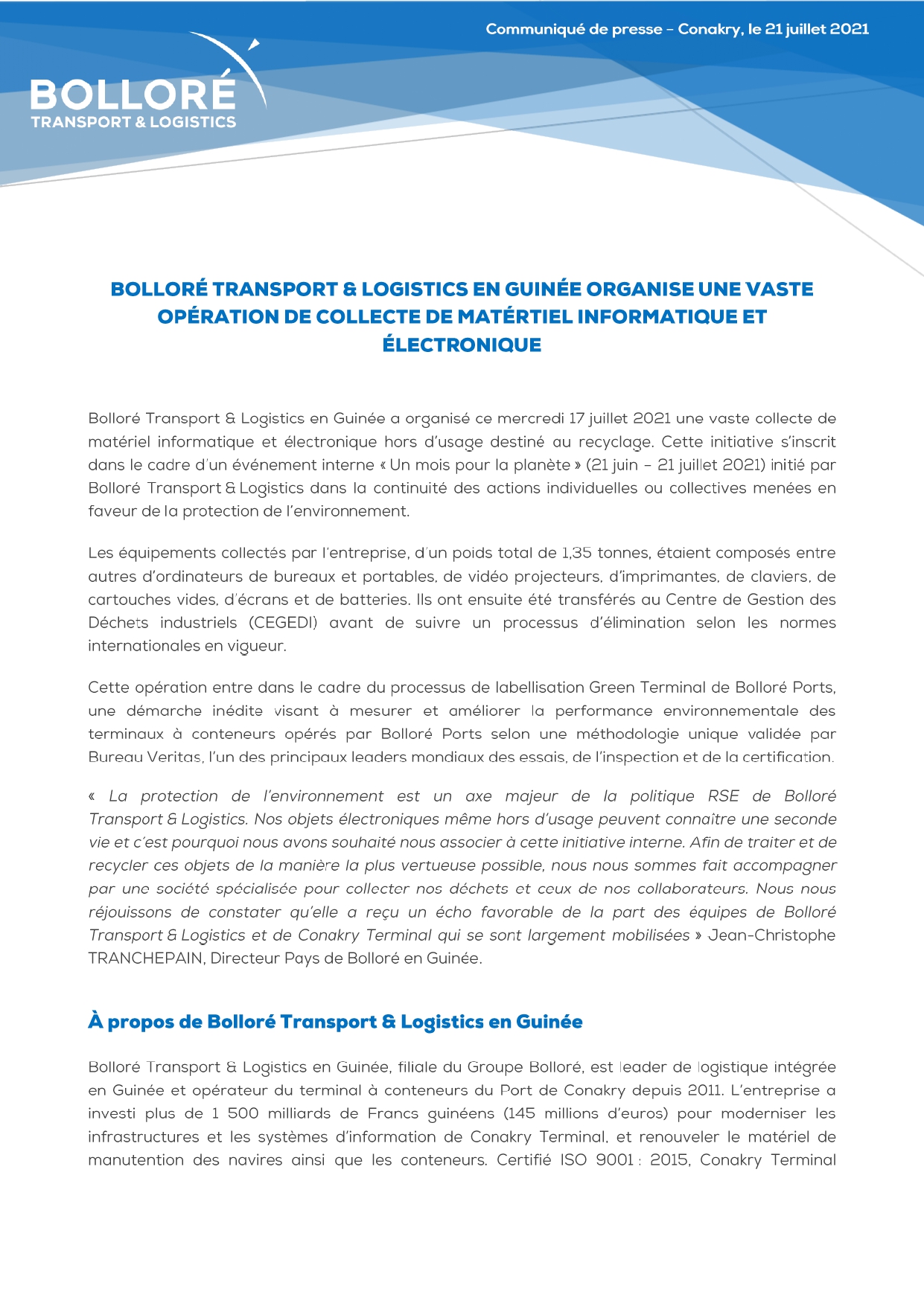 L’article Bolloré Transport & Logistics en Guinée organise une vaste opération de collecte de matériel informatique et électronique est apparu en premier sur Mediaguinee.org.