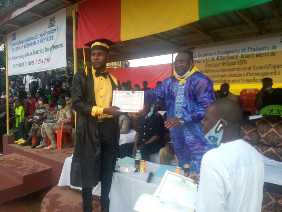 La cérémonie de remise de diplômes de la 17ème promotion, 11ème de LMD a eu lieu ce week-end à l’Université de N’zérékoré. C’est le gouverneur de la région administrative du même nom qui a présidé ladite cérémonie en présence des autorités universitaires, des services de sécurité et de la défense, ainsi que de toutes les composantes sociales de la ville. Ils sont au total, 585 dont 120 filles des 8 départements qui ont obtenu leur diplôme de fin d’études universitaires dans ce temple du savoir.