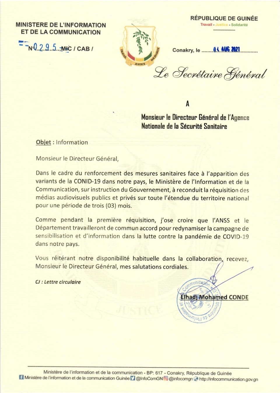 L’article Covid-19 : le Ministère de l’Information et de la Communication reconduit la réquisition des médias pour une période de 3 mois est apparu en premier sur Mediaguinee.org.