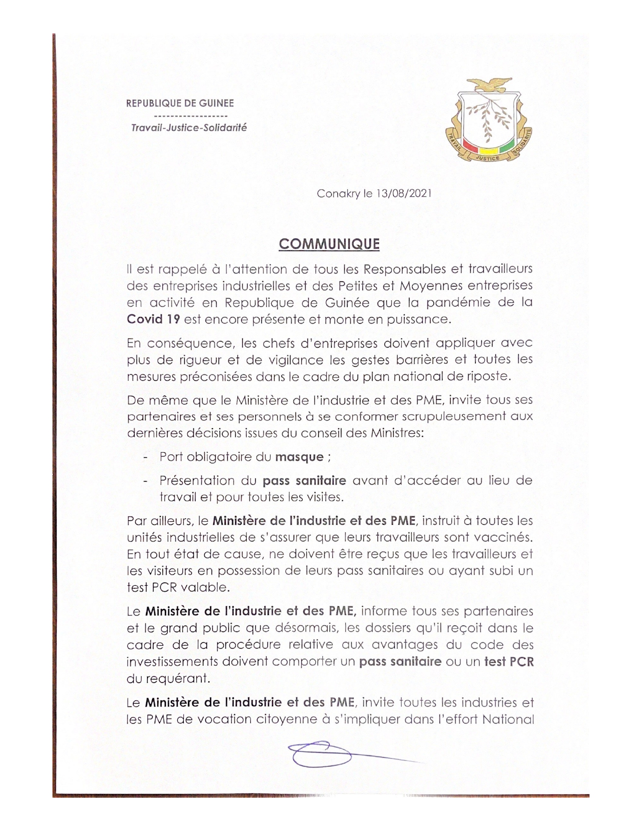 Dans un communiqué, le ministre d’Etat Tibou Kamara a demandé aux entreprises indutrielles et petites et moyennes entreprises d’exiger le port du masque et la présentation du pass sanitaire avant d’accéder au lieu de travail et pour toutes visites.