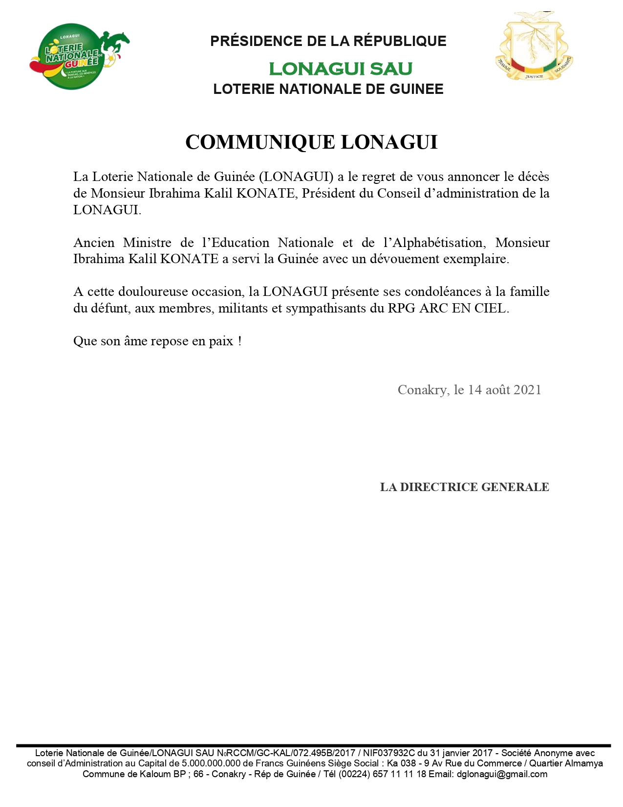 Le président du Conseil d’administration de la Loterie nationale de Guinée (LONAGUI) et ancien ministre Ibrahima Kalil Konaté (K²) est décédé ce samedi à Conakry des suites de maladie. La directrice générale de la Lonagui a adressé ses condoléances à la famille du défunt, aux membres, militants et sympathisants du du RPG-ARC-EN-CIEL