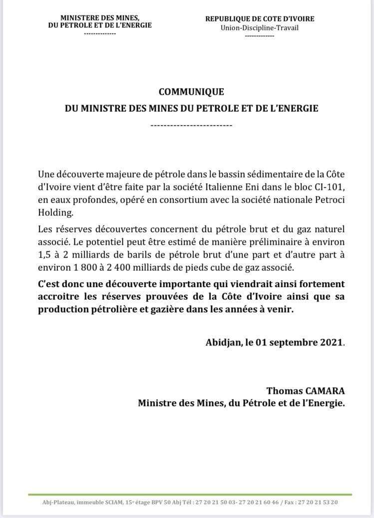 Par ailleurs, le ministère estime que cette découverte importante devrait fortement accroître les réserves prouvées de la Côte d’Ivoire, ainsi que sa production pétrolière et gazière dans les années à venir.