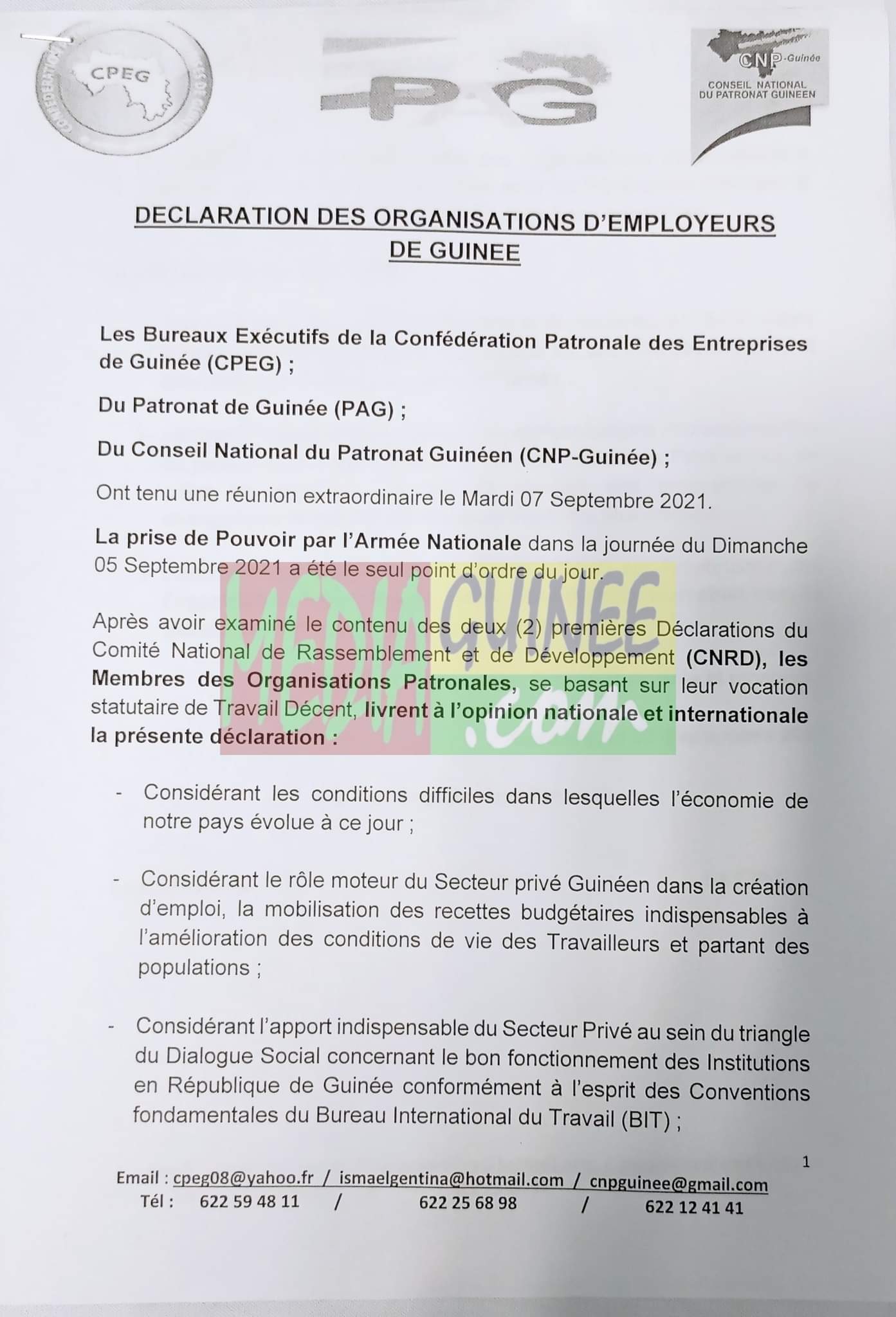 Les Bureaux Exécutifs de la Confédération Patronale des Entreprises de Guinée (CPEG); du Patronat de Guinée (PAG) ; et du Conseil National du Patronat Guinéen (CNP-Guinée) ont pris acte de l’ensemble des faits et déclarations du CNRD visant le rassemblement du peuple, la cohésion sociale et le développement économique de la Guinée. Ils l’ont fait savoir ce mercredi 08 septembre lors d’un point de presse à Conakry.