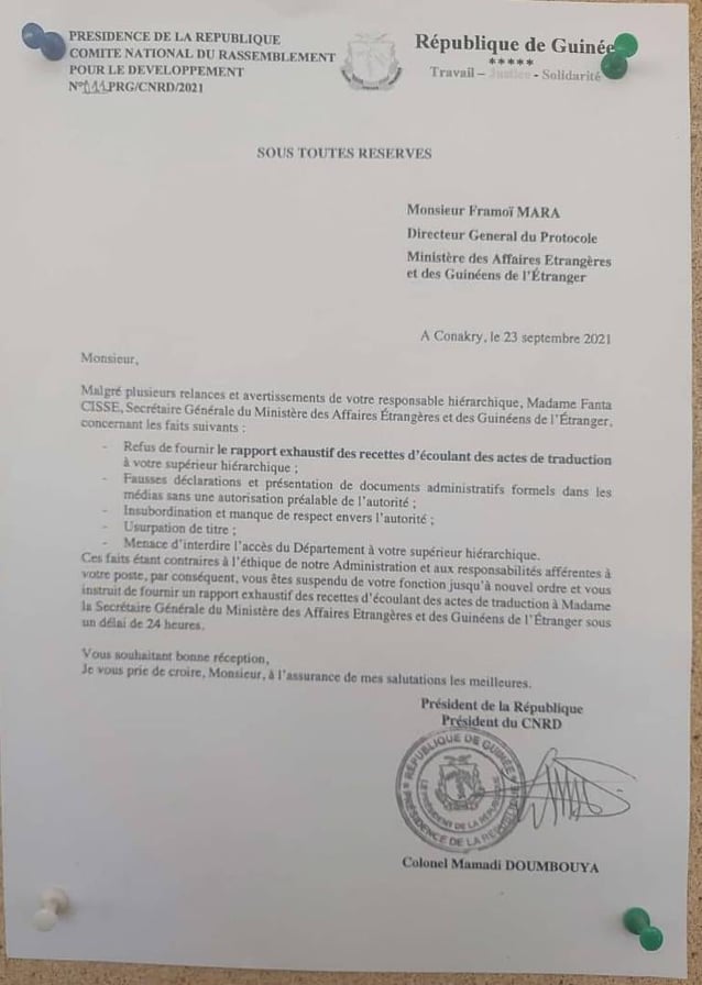 Par ailleurs, il a été demandé à Framoï Mara, concerné par le « refus de fournir le rapport exhaustif des recettes découlant des actes de traduction a votre supérieur hiérarchique » et à Mama Aïssata Bangoura, concernée par le « refus de fournir le rapport exhaustif des recettes découlant des actes de législation à votre supérieur hiérarchique », de fournir lesdits documents à la secrétaire générale dudit ministère. Ci-dessous, les actes.