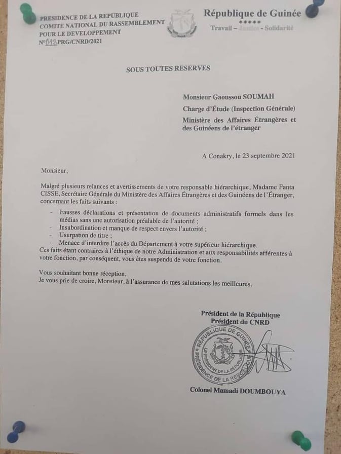 Des cadres du ministère des Affaires étrangères et des Guinéens de l’étranger ont été suspendus par le président du CNRD, le colonel Mamadi Doumbouya, le 23 septembre. Il s’agit de mesdames Mama Aissata Bangoura, directrice générale des Affaires juridiques et consulaires; Aminata Camara, conseillère chargée de mission; de messieurs Framoï Mara, directeur général du protocole et Gaoussou Soumah, chef d’études (inspection générale).