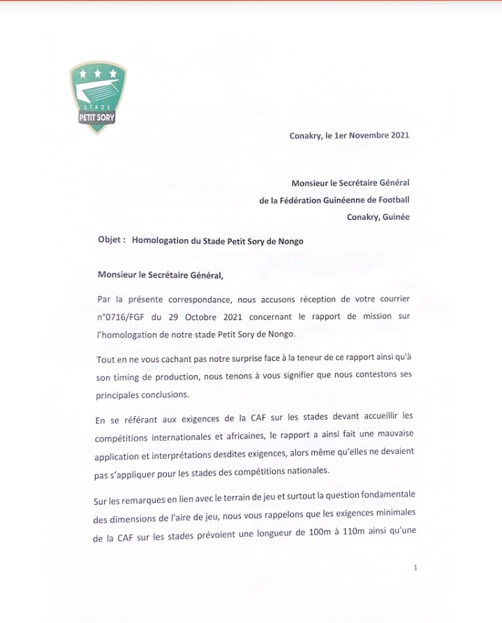CONAKRY- Dans un courrier adressé à la Fédération Guinéenne de Football, la direction du stade Petit Sory de Nongo conteste les conclusions du rapport des inspecteurs dépêches par la Féguifoot. Dans ledit rapport, la fédération n’a pas homologué le stade Petit Sory, sous prétexte qu’il y aurait encore des travaux restant à faire, et qui ne répondent pas aux normes internationales