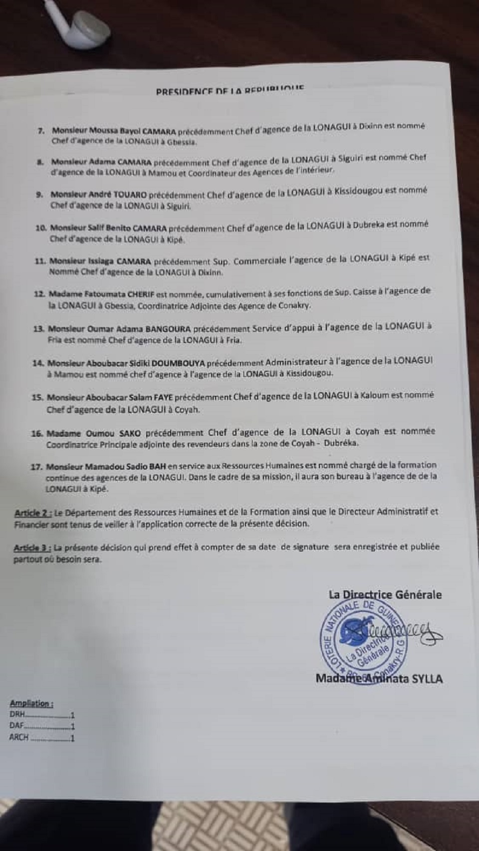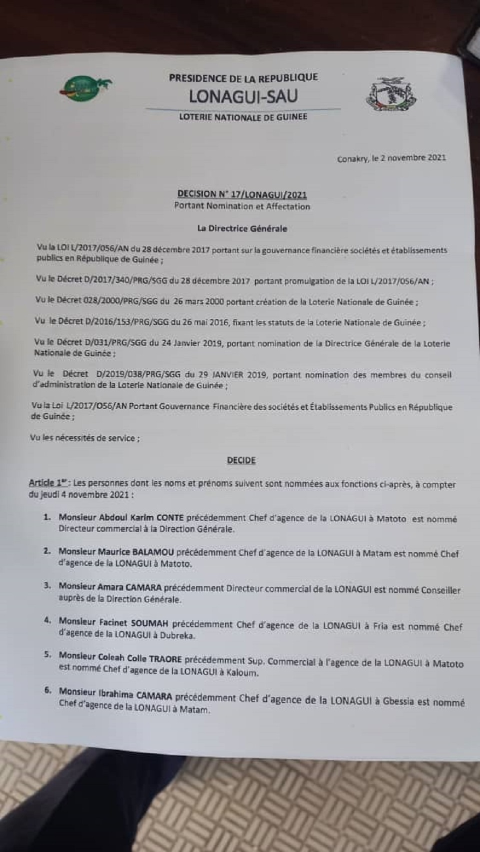 Dans une décision datant du 2 novembre dernier, la Directrice générale de la Loterie Nationale de Guinée (LONAGUI), Aminata Sylla a procédé à des nominations et affections de certains de ses travailleurs. Ci-dessous décision