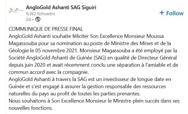 Le communiqué d’Anglogold Ashanti SAG, favorable à M Moussa Magassouba (voir ci-dessous), a été publié après sa nomination, mettant définitivement fin aux rumeurs.