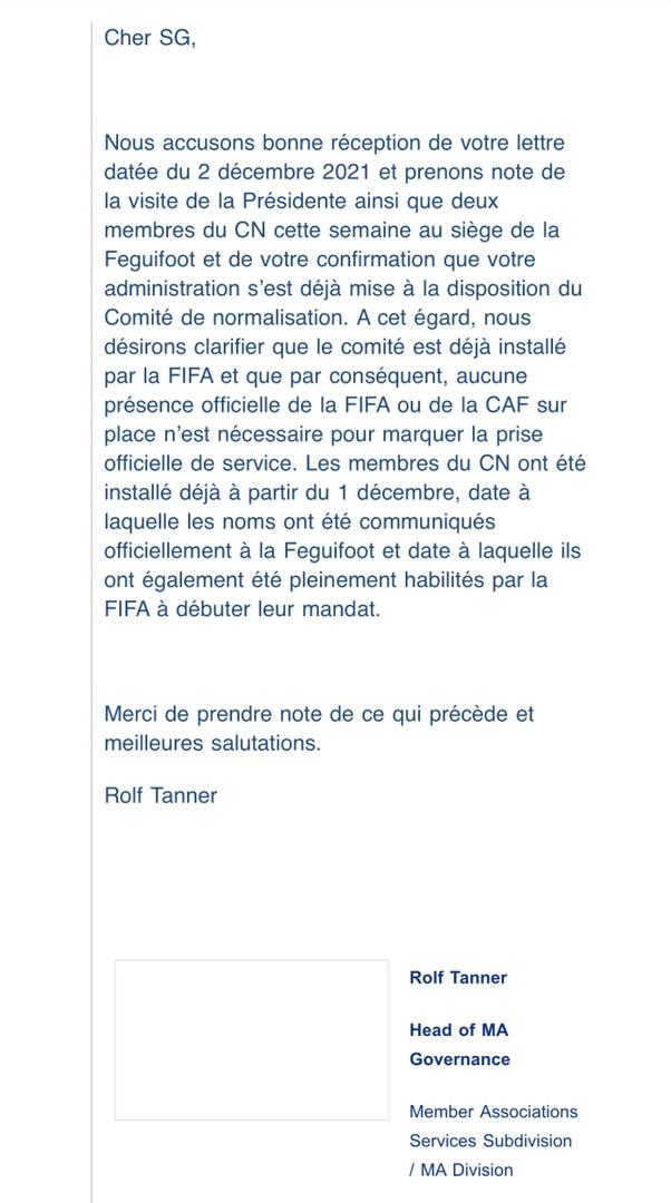En réponse à cette lettre du 2 décembre, Rolf Tanner de la FIFA a recadré le chef de l’administration de la Féguifoot en lui indiquant que les membres du comité de normalisation sont déjà installés.
