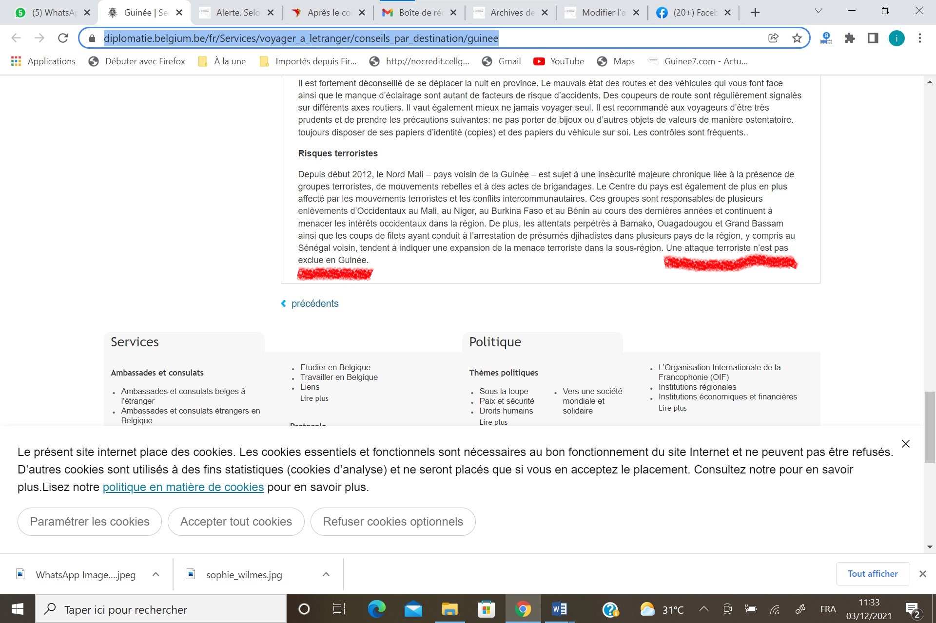 Il faut d’ailleurs dire à cette ambassade qu’en matière d’information, nous pouvons discuter de ce qui n’a pas été dit. Dès lors que le ministère des Affaires étrangères belge -en témoigne la capture ci-dessous-, dit qu’«une attaque terroriste n’est pas exclue en Guinée », tenter de modifier le sens de cette note officielle n’est que peine perdue. En journalisme, les faits sont sacrés -Et têtus. La motivation ou le destinataire de l’avis ne peut absolument rien y changer.
