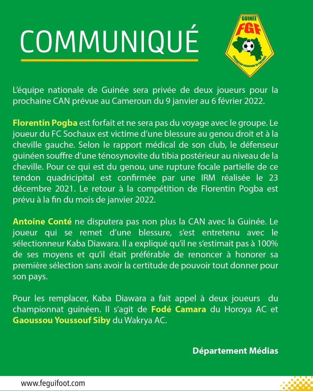 Quant au second forfait, le communiqué indique que : « Antoine Conté ne disputera pas non plus la CAN avec la Guinée. Le joueur qui se remet d’une blessure, s’est entretenu avec le sélectionneur Kaba Diawara. Il a expliqué qu’il ne s’estimait pas à 100% de ses moyens et qu’il était préférable de renoncer à honorer sa première sélection sans avoir la certitude de pouvoir tout donner pour son pays ».