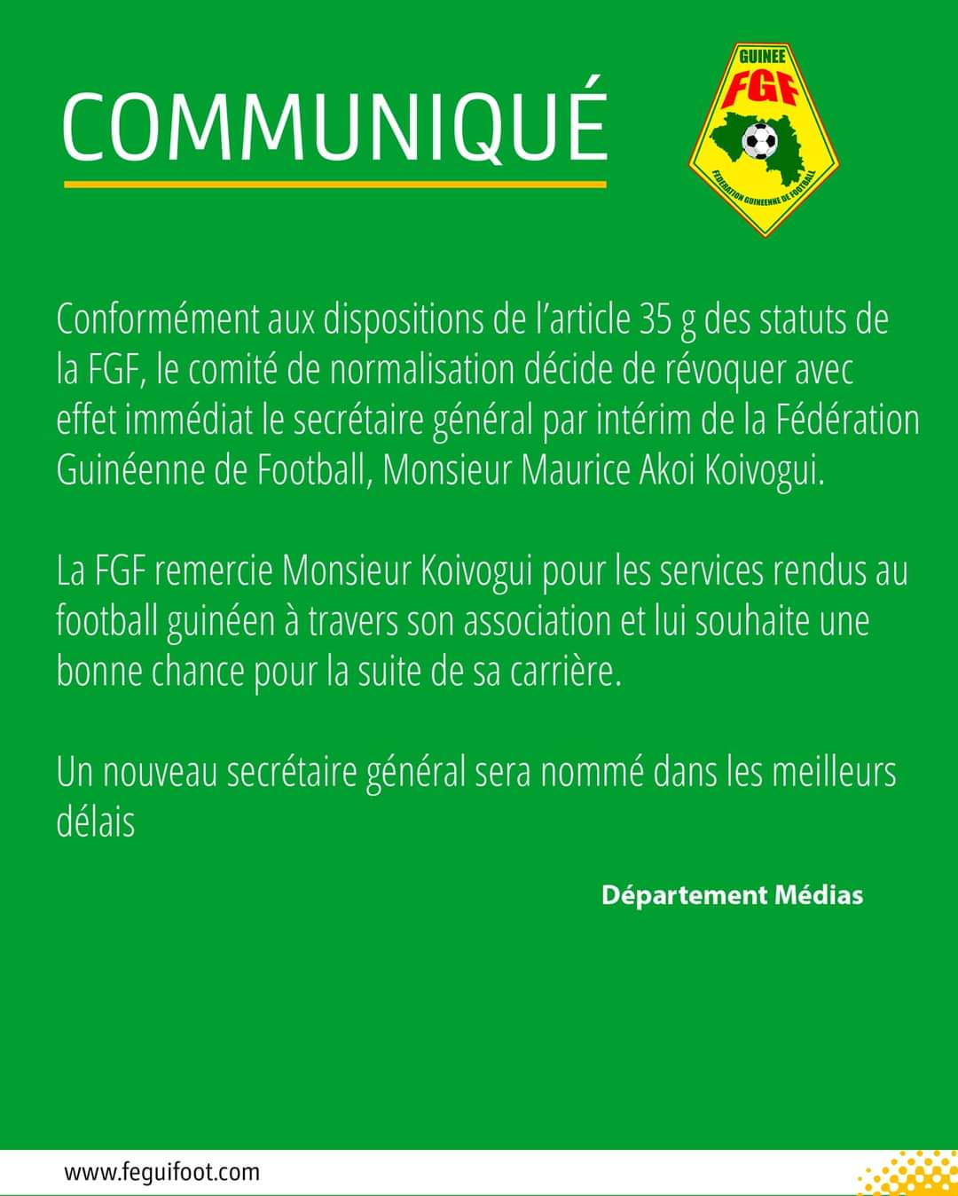 « Conformément aux dispositions de l’article 35 g des statuts de la FGF, le comité de normalisation décide de révoquer avec effet immédiat le secrétaire général par intérim de la Fédération Guinéenne de Football, Monsieur Maurice Akoï Koïvogui. La FGF remercie Monsieur Koïvogui pour les services rendus au football guinéen à travers son association et lui souhaite une bonne chance pour la suite de la carrière », souligne le communiqué.