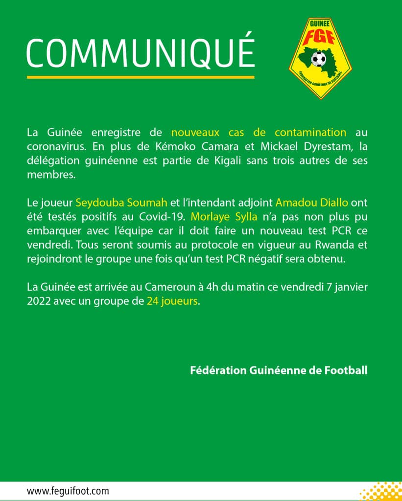 De nouveaux cas de Covid19 ont été enregistrés au sein de l’équipe nationale de football de Guinée. Lire ci-dessous le communiqué de la fédération guinéenne de football.