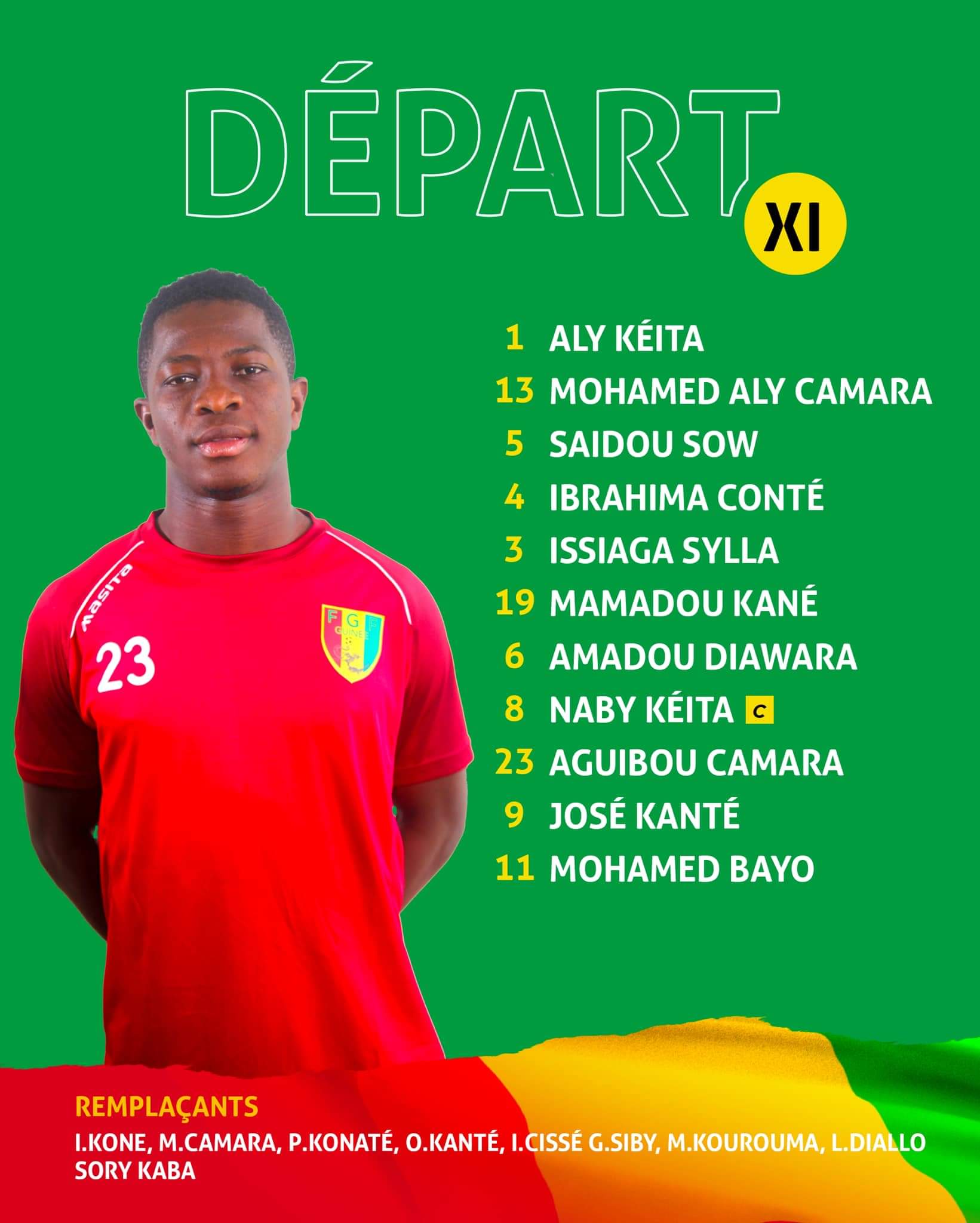 En défense, Saidou Sow, Mohamed Ali Camara, Issiaga sylla et Ibrahima Conté sont alignés. Le capitaine Naby Keita évoluera au milieu de terrain aux côtés de Mamadou Kané et Amadou Diawara. A l’attaque, Aguibou Camara est associé à José Martinez Kanté et Mohamed Bayo.