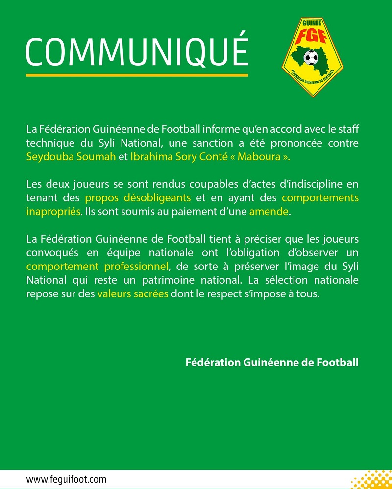 Un communiqué de la fédération guinéenne de football sanctionne au paiement d’une amende, les joueurs Seydouba Soumah et Ibrahima Sory Conté « Maboura » qui auraient eu maille à partir avec des membres du CONOR. Ci-dessous le communiqué.