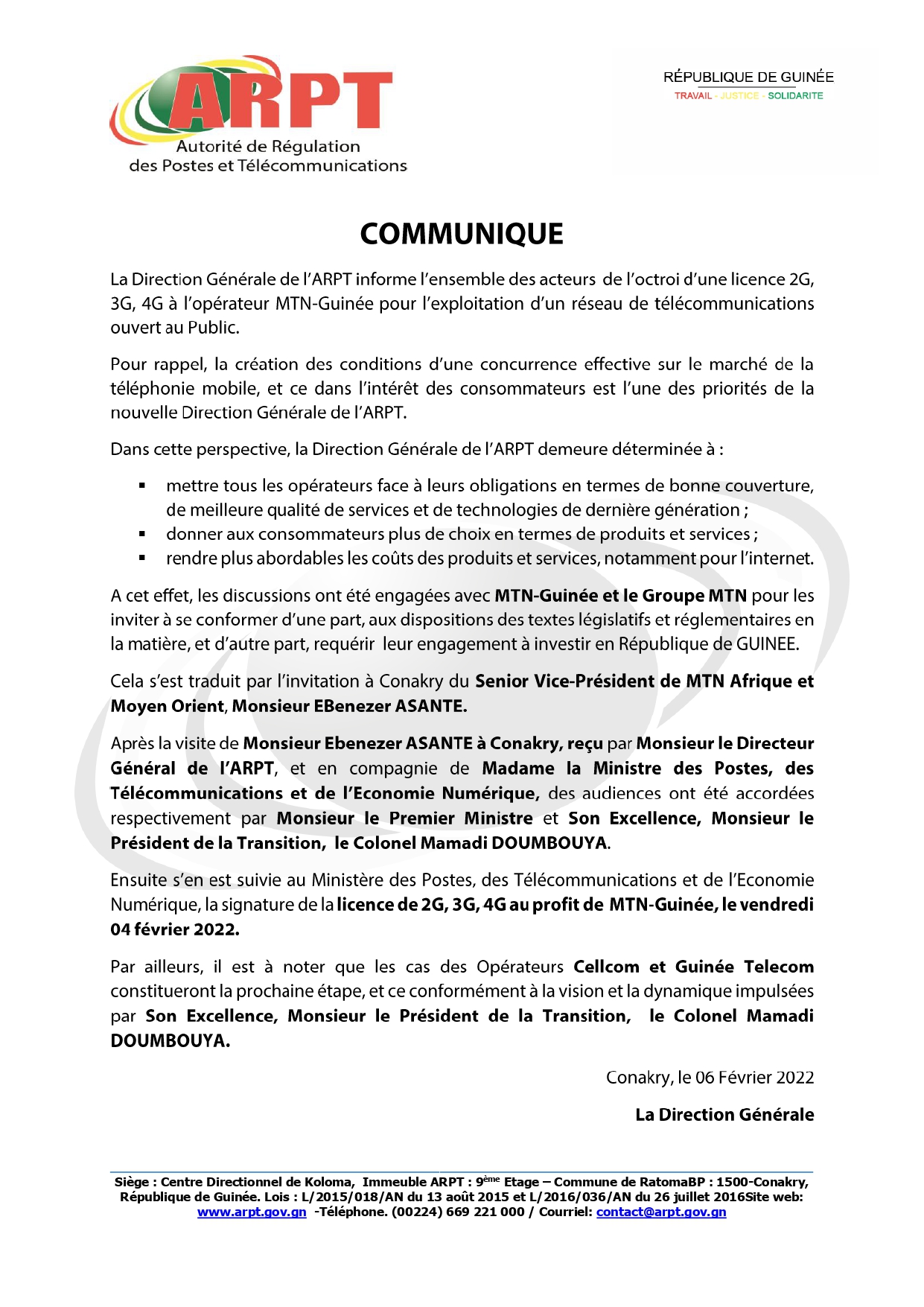 La société MTN-Guinée entre dans le club de la 4G. Dans un communiqué, la direction générale de l’Autorité de régulation des Postes et télécommunications (ARPT) annonce l’octroi d’une licence 2G, 3G, 4G à l’opérateur sud-africain pour « l’exploitation d’un réseau de télécommunications ouvert au Public ». Annonçant que les cas des opérateurs Cellcom et Guinée Télécom constitueront la prochaine étape…