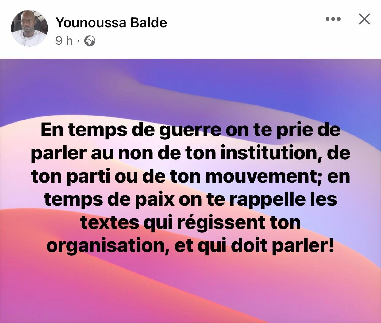 D’abord c’est le général des jeunes Younoussa Baldé lui-même qui donne le ton en écrivant ceci : « On peut nous priver de parole à une radio, ou dans une émission, mais pas à toutes les radios ou dans toutes les émissions. » Il ne se limite pas là, une heure après cette publication, il renchérît « En temps de guerre, on te prie de parler au nom de ton institution, de ton parti ou de ton mouvement ; en temps de paix, on te rappelle les textes qui régissent ton organisation et qui doit parler », écrit-il.