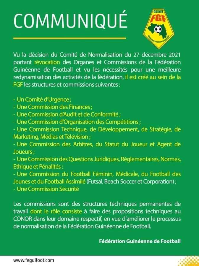 CONAKRY- Dans un communiqué publié sur ses canaux de communication ce mardi, le comité de normalisation de la Féguifoot a annoncé la mise en place de plusieurs commissions techniques permanentes.