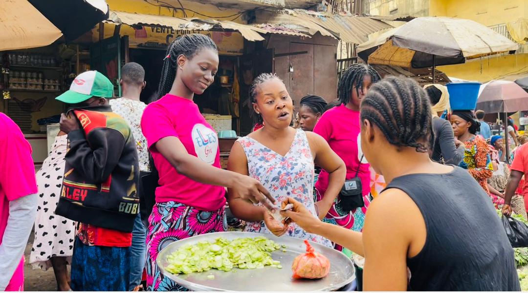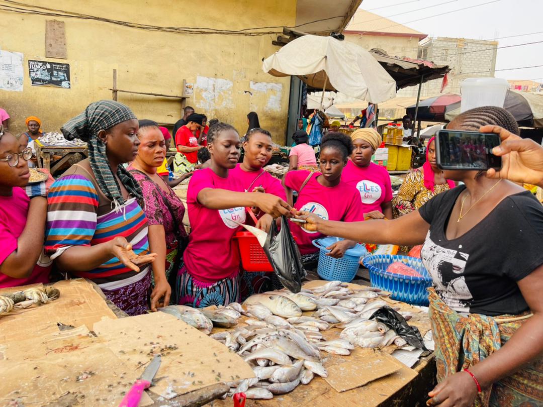 Selon la présidente de l’ONG, pour ce premier contact, à l’occasion de la journée internationale des droits de la femme, »Elles » décide de rencontrer les femmes au foyer pour les soutenir financièrement dans leur achat au marché de Madina Wambélé, une manière pour ces filles de dénoncer la cherté de la vie.