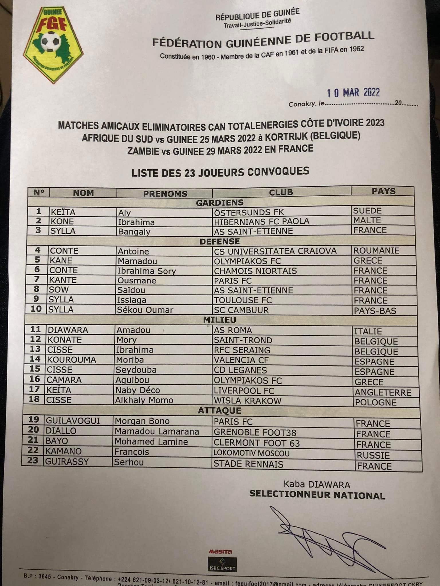 François Kamano fait son retour, par contre, toujours pas de Mady Camara. Seydouba Soumah et Ibrahima Sory Conté Maibra sont absents, tout comme le gardien Moussa Camara et Moralye Sylla, tous du Horoya AC. Aucun joueur local donc n’a été retenu.