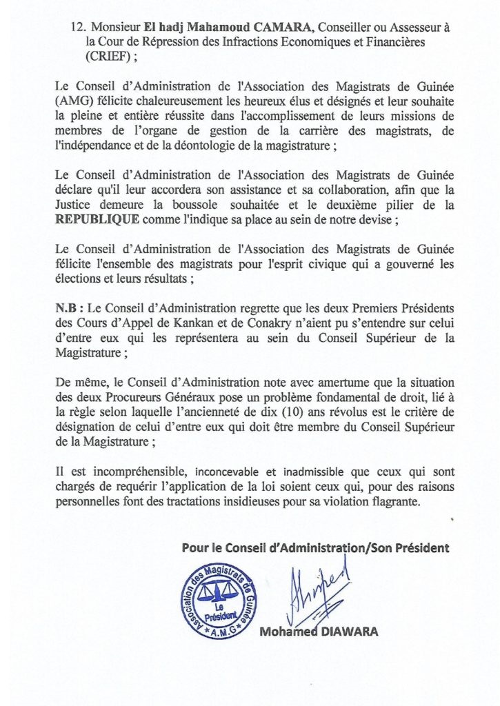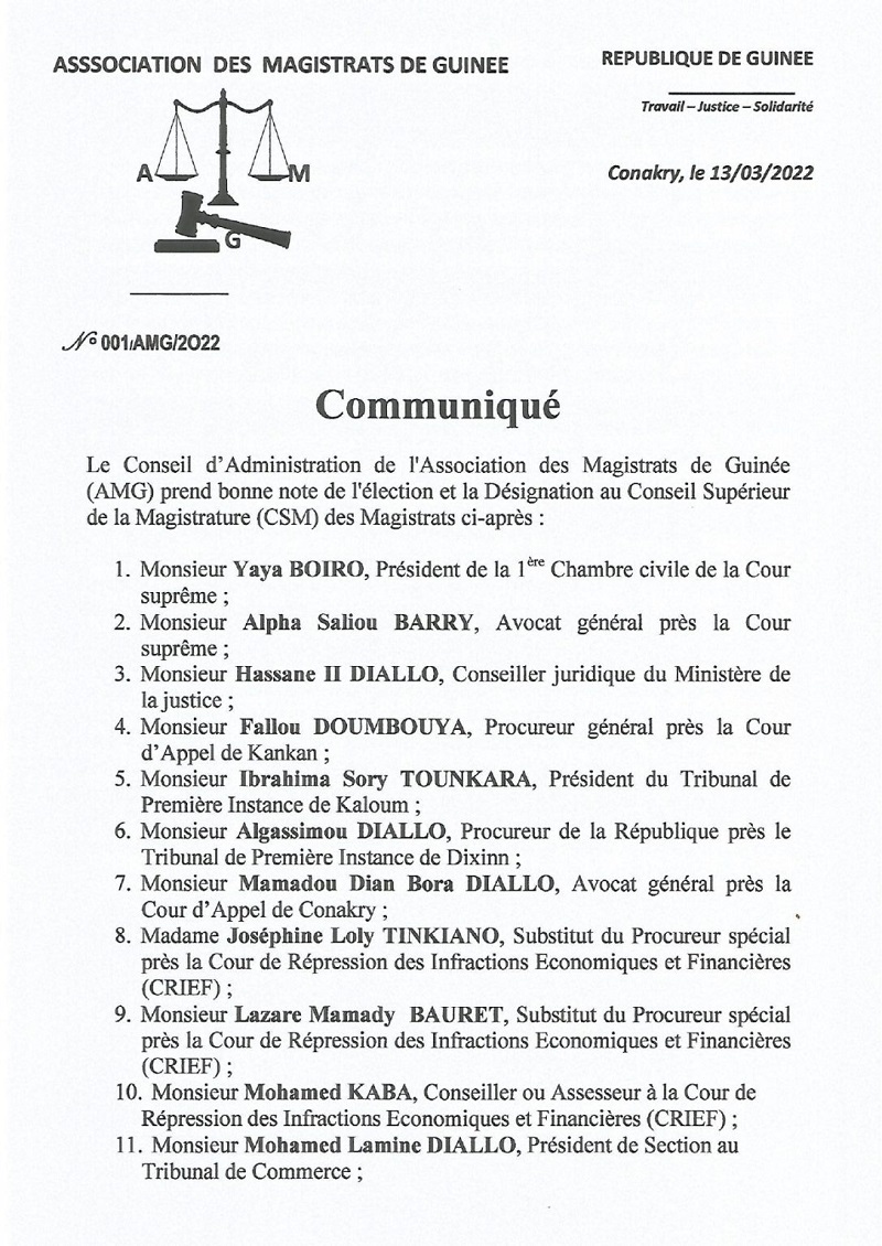 Dans un communiqué dont copie a été transmise à guinee7.com, le Conseil d’Administration (CA) de l’Association des Magistrats de Guinée (AMG) -présidé désormais par le juge Mohamed Diawara- met en garde contre toute violation des lois qui régissent le Conseil Supérieur de la Magistrature (CSM)…