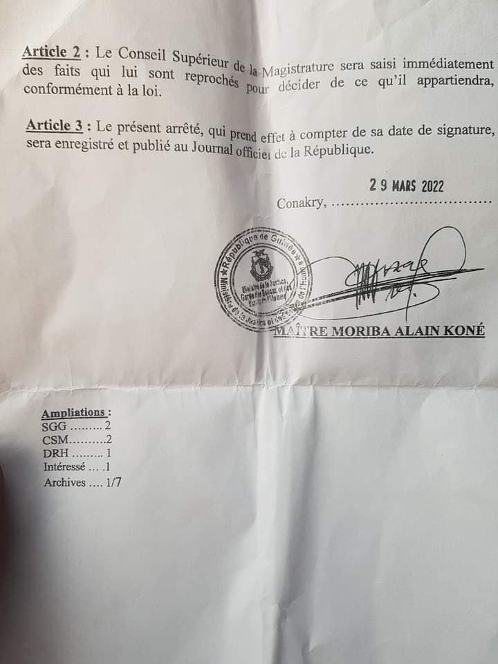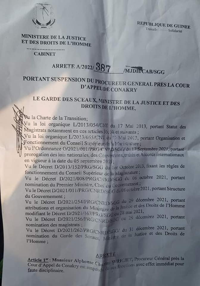 Le ministre de la Justice garde des sceaux, Me Moriba Alain Koné, par un arrêté a suspendu le procureur général près la Cour d’appel de Conakry, Charles Wright, pour « faute disciplinaire » avec effet immédiat. La sanction se fait au lendemain de la sortie du magistrat contre le haut commandant de la Gendarmerie, Balla Samoura. Ci-dessous l’arrêté du ministre.