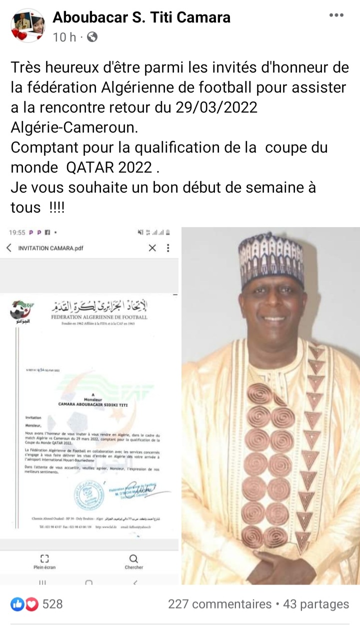 « Nous avons l’honneur de vous inviter à vous rendre en Algérie dans le cadre du match retour Algérie Cameroun comptant pour la qualification de la coupe du monde 2022 » écrit la fédération algérienne. L’ex international guinéen n’a pas caché sa joie sur son compte Facebook.