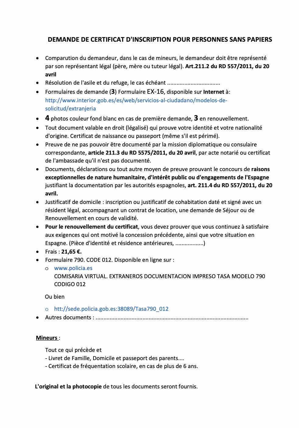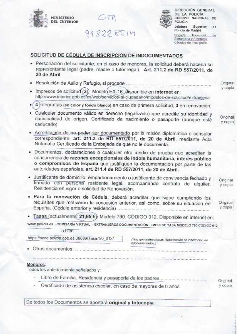 Enfin, pour matérialiser cette rencontre, il est demandé dans le processus de renouvellement comme pour une première demande de permis de résidence de se munir d’abord de la CARTE D’ENREGISTREMENT (CÉDULA DE INSCRIPCIÓN DE INDOCUMENTADOS).