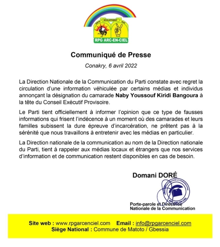 Certains médias ont annoncé Kiridi Bangoura à la tête du Conseil exécutif provisoire du RPG AEC dès après l’incarcération de Kassory Fofana. « faux », rétorque le parti dans un communiqué que voici.
