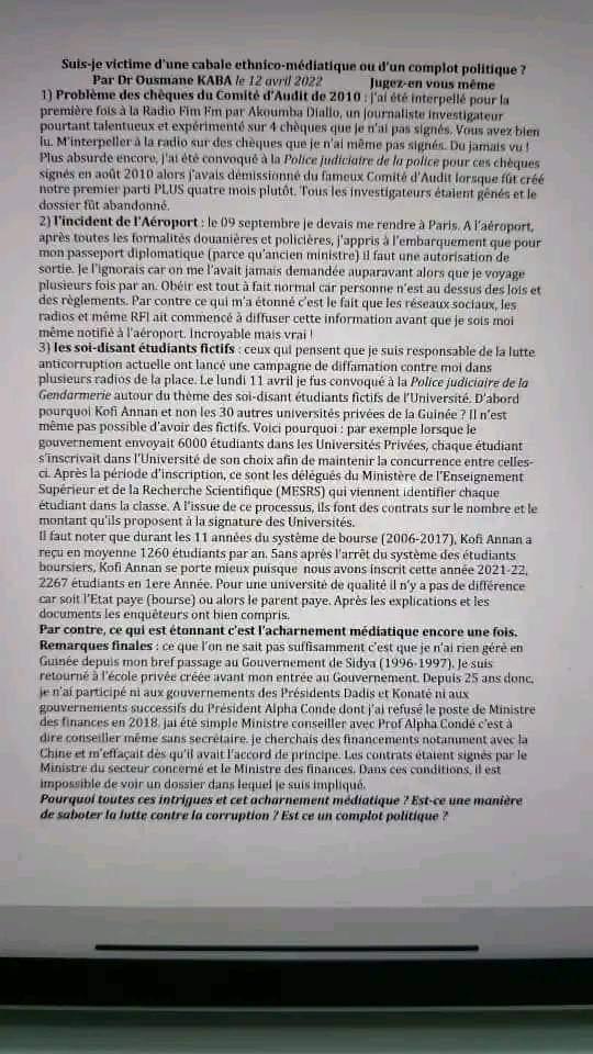 Remarques finales : ce que l’on ne sait pas suffisamment, c’est que je n’ai rien géré en Guinée depuis mon bref passage au Gouvernement de Sidya (1996-1997), Je suis retourné à l’école privée créée avant mon entrée au Gouvernement. Depuis 25 ans, donc je n’ai participé ni aux gouvernements des Présidents Dadis et Konaté ni aux gouvernements successifs du Président Alpha Condé dont j’ai refusé le poste de Ministre des finances en 2018. J’ai été simple Ministre conseiller avec Prof Alpha Condé c’est à dire conseiller même sans secrétaire, je cherchais des financements notamment avec la Chine et m’effaçait dès qu’il avait l’accord de principe Les contrats étaient signés par le Ministre du secteur concerné et le Ministre des finances. Dans ces conditions, il est impossible de voir un dossier dans lequel je suis impliqué. Pourquoi toutes ces intrigues et cet acharnement médiatique ? Est-ce une manière de saboter la lutte contre la corruption ? Est-ce un complot politique ?