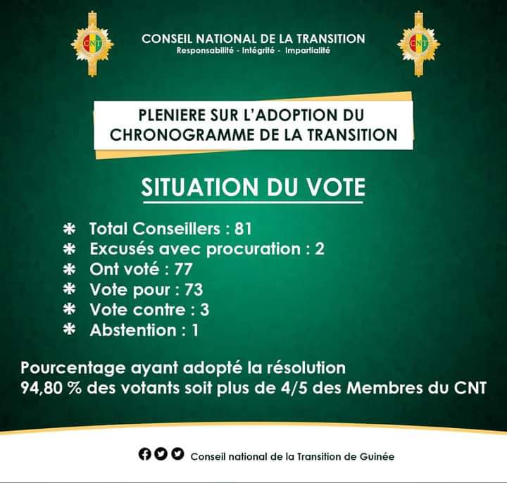 Le Conseil national de la transition (CNT) a adopté lors de sa plénière du mercredi 11 mai 2022, en présence des membres du gouvernement et des représentations diplomatiques, un chronogramme de 36 mois comme durée de la Transition. Le décompte du vote ne semble pas refléter la réalité. C’est ce que nous fait croire en tout cas, un conseiller, Ahmed Tidiane Sylla, à travers un poste ce matin. « L’honnêteté intellectuelle et institutionnelle voudraient qu’en plus des trois (3) conseillers qui sont restés pour voter contre cette #résolution, on ajoute en plus les trois ( 3 ) conseillers qui ont quitté la plénière pour marquer leur désapprobation par rapport à cette adoption du chronogramme considérée comme violation de la #Charte », s’est indigné le conseiller qui dit avoir quitté la plénière. Ci-dessous les résultats du vote, tels qu’il les a publiés sur sa page facebook.