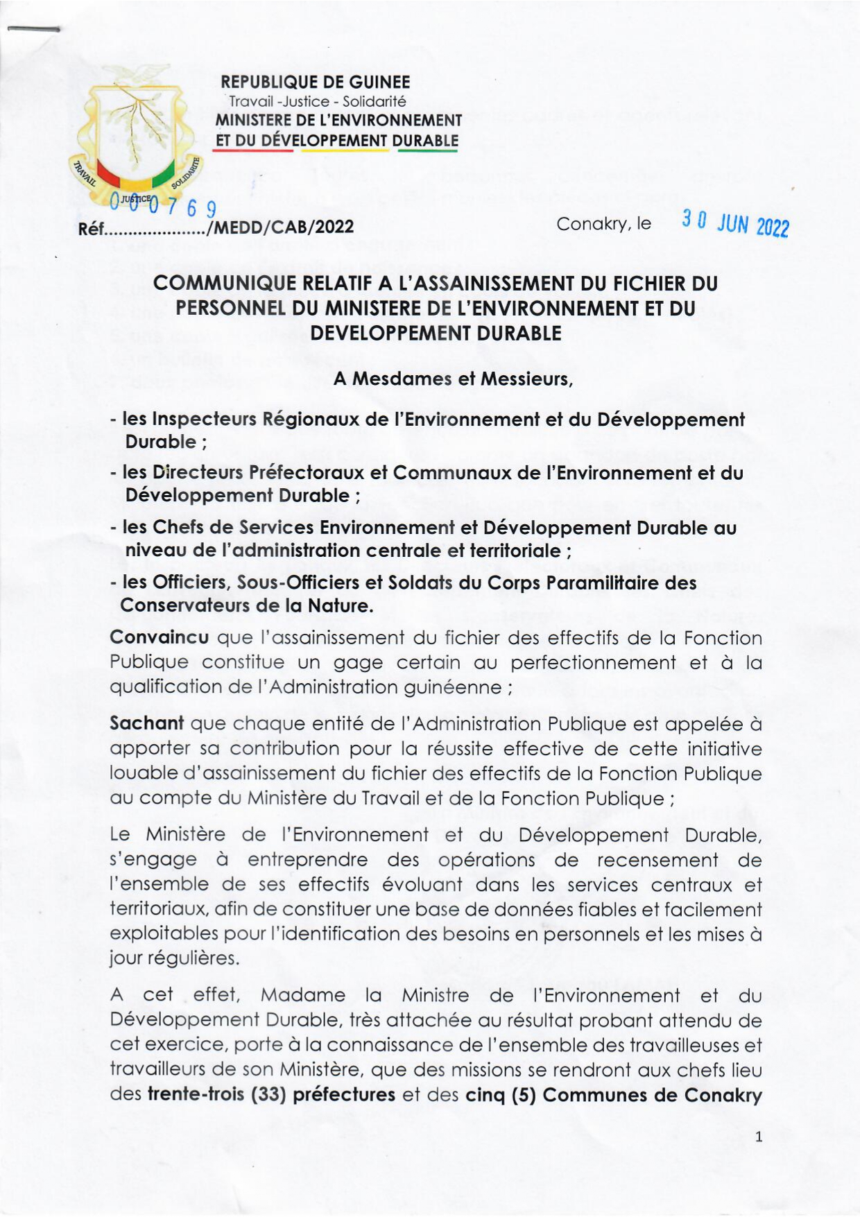 L’article Ministère de l’Environnement : communiqué relatif à l’assainissement du fichier du personnel est apparu en premier sur Mediaguinee.org.