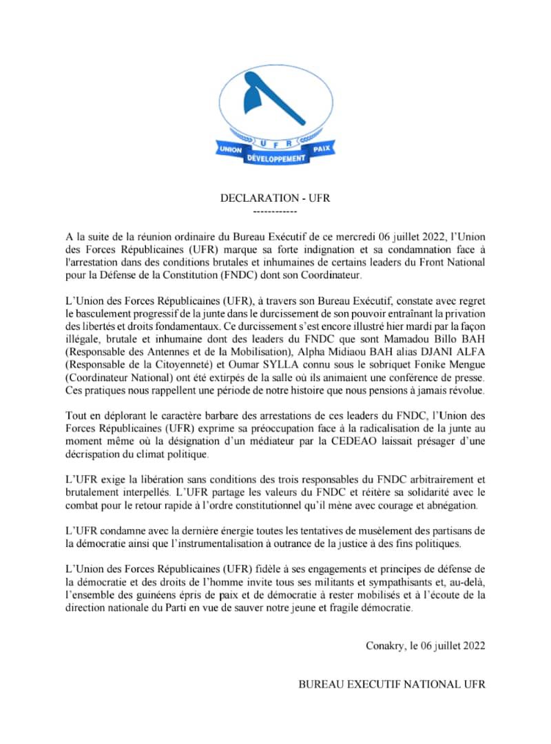 A la suite de la réunion ordinaire du Bureau Exécutif de ce mercredi 06 juillet 2022, l’Union des Forces Républicaines (UFR) marque sa forte indignation et sa condamnation face à l’arrestation dans des conditions brutales et inhumaines de certains leaders du Front National pour la Défense de la Constitution (FNDC) dont son Coordinateur.