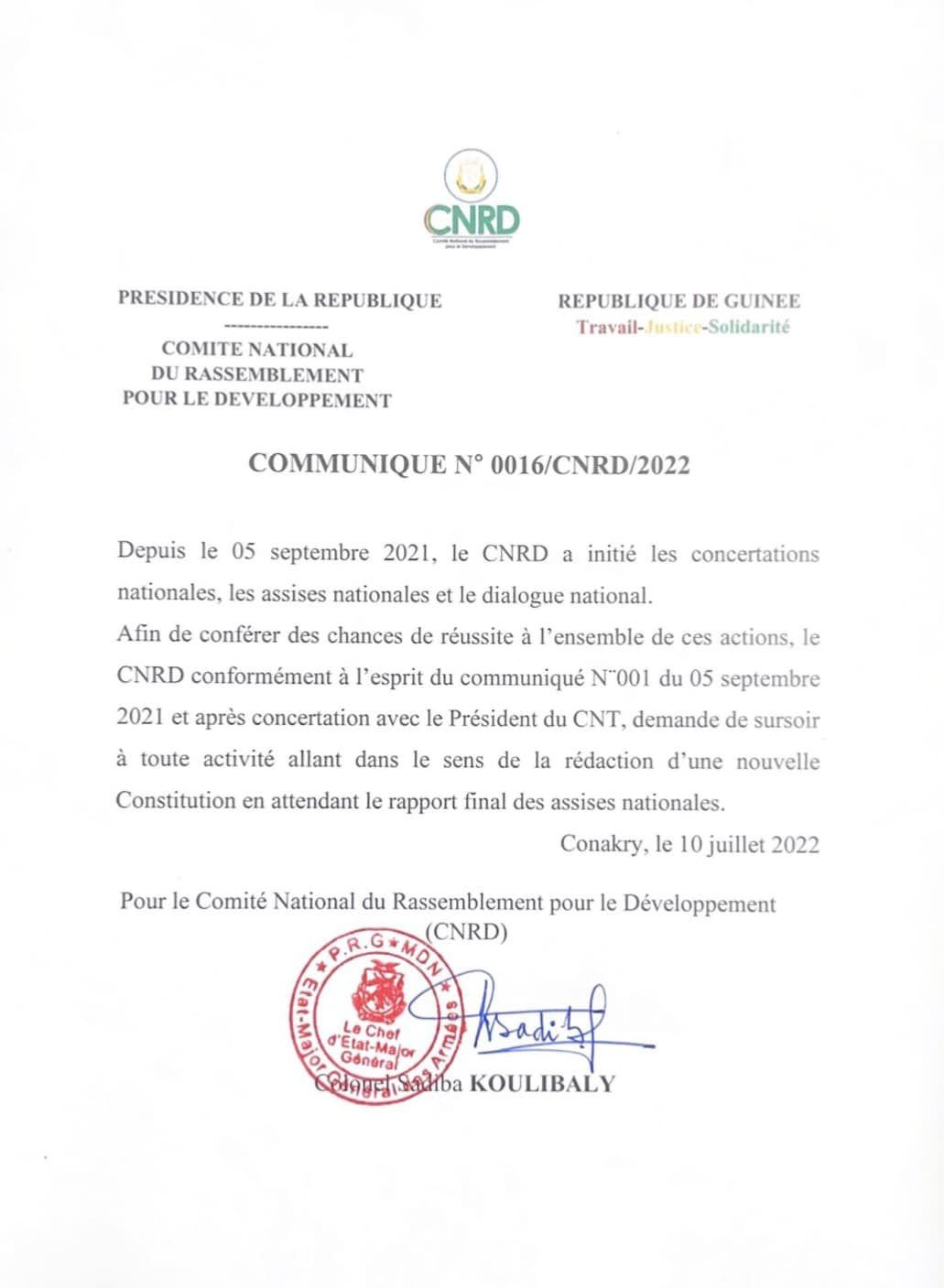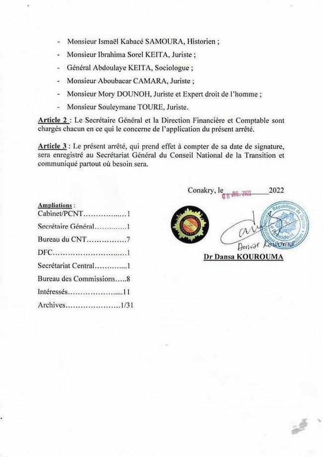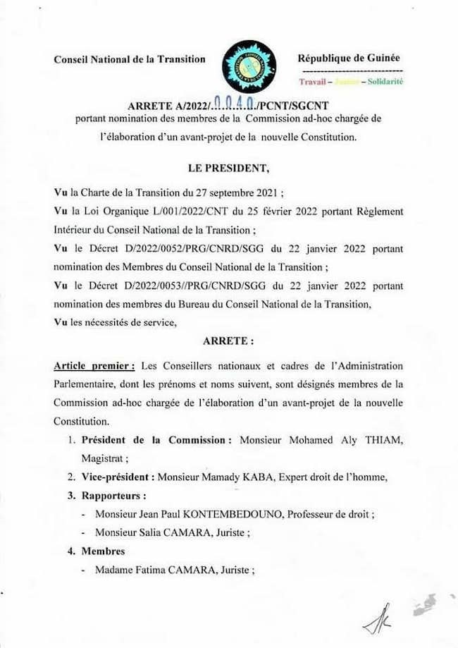 Dansa Kourouma, président du CNT a mis en place une commission ad-hoc chargée de l’élaboration d’un avant-projet d’une nouvelle Constitution. Dirigée par l’ancien président de l’Association des magistrats de Guinée, Mohamed Aly Thiam, conseiller au CNT, cette commission aura fait long feu. Car le CNRD demande de sursoir à toute activité allant dans le sens de la rédaction d’une nouvelle constitution. Lire ci-dessous les deux actes.