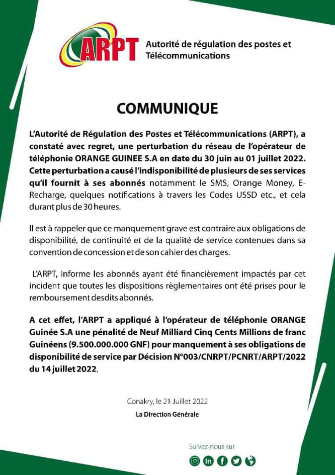 Dans un communiqué rendu public ce jeudi, l’Agence de régulation des postes et télécommunications (ARPT) a sanctionné l’opérateur de téléphonie Orange Guinée, au paiement de 9 milliards 500 millions de francs pour « les perturbations constatées sur son réseau les 30 juin et 1er juillet dernier ».