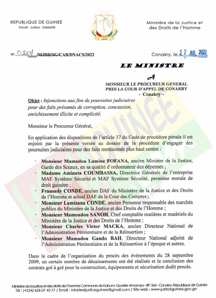 L’automne des anciens dignitaires du régime d’Alpha Condé? L’actuel ministre de la Justice Alphonse Charles Wright a écrit au procureur général près la Cour d’Appel de Conkry pour l’enjoindre d’engager des poursuites contre Mamadou Lamine Fofana, ancien ministre de la Justice sous Alpha Condé et six autres pour des faits présumés de « détournement de corruption, concussion, enrichissement illicite et complicité ».