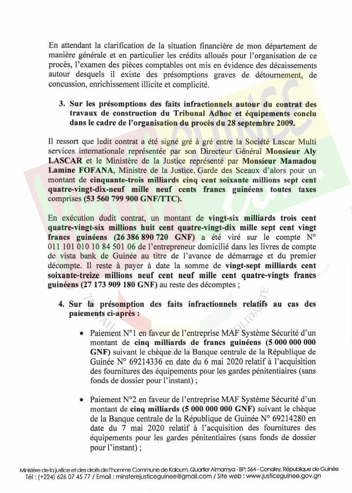 Le montant incriminé s’élève exactement à 53 milliards 560 millions 799 mille 900 francs guinéens /TTC. Le dossier concerne le contrat des travaux de construction du Tribunal adhoc et équipements conclus dans le cadre de l’organisation du procès du 28 septembre.
