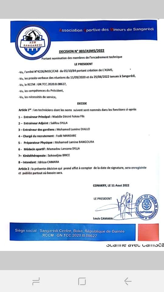 SANGARÉDI- L’AS Mineurs de Sangarédi compte marquer son retour en Ligue 1 de football, 13 ans après son dernier passage dans l’élite. Le club minier vient de dévoiler la liste des membres du staff technique où figure notamment le nom de Fodé Mansaré.