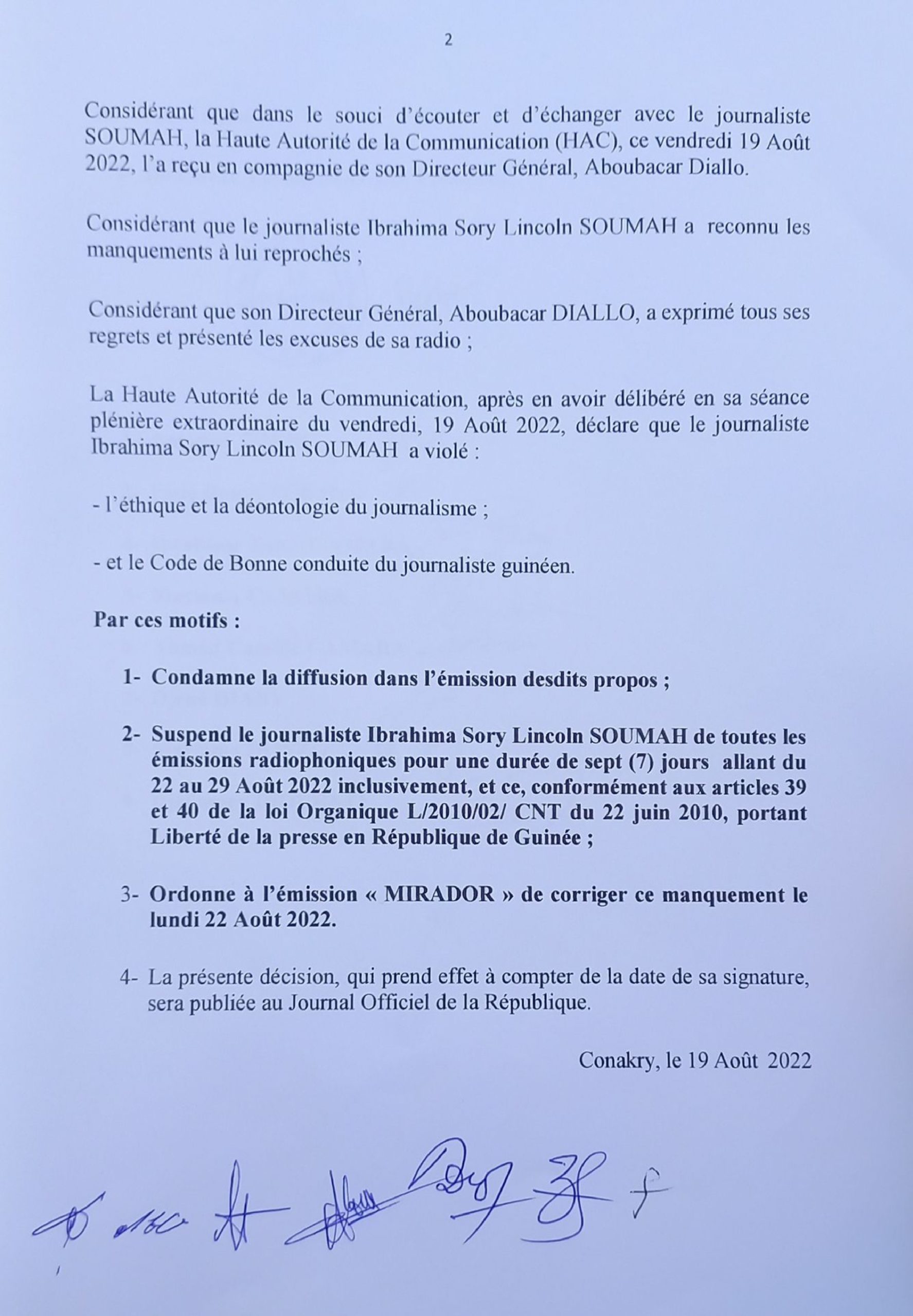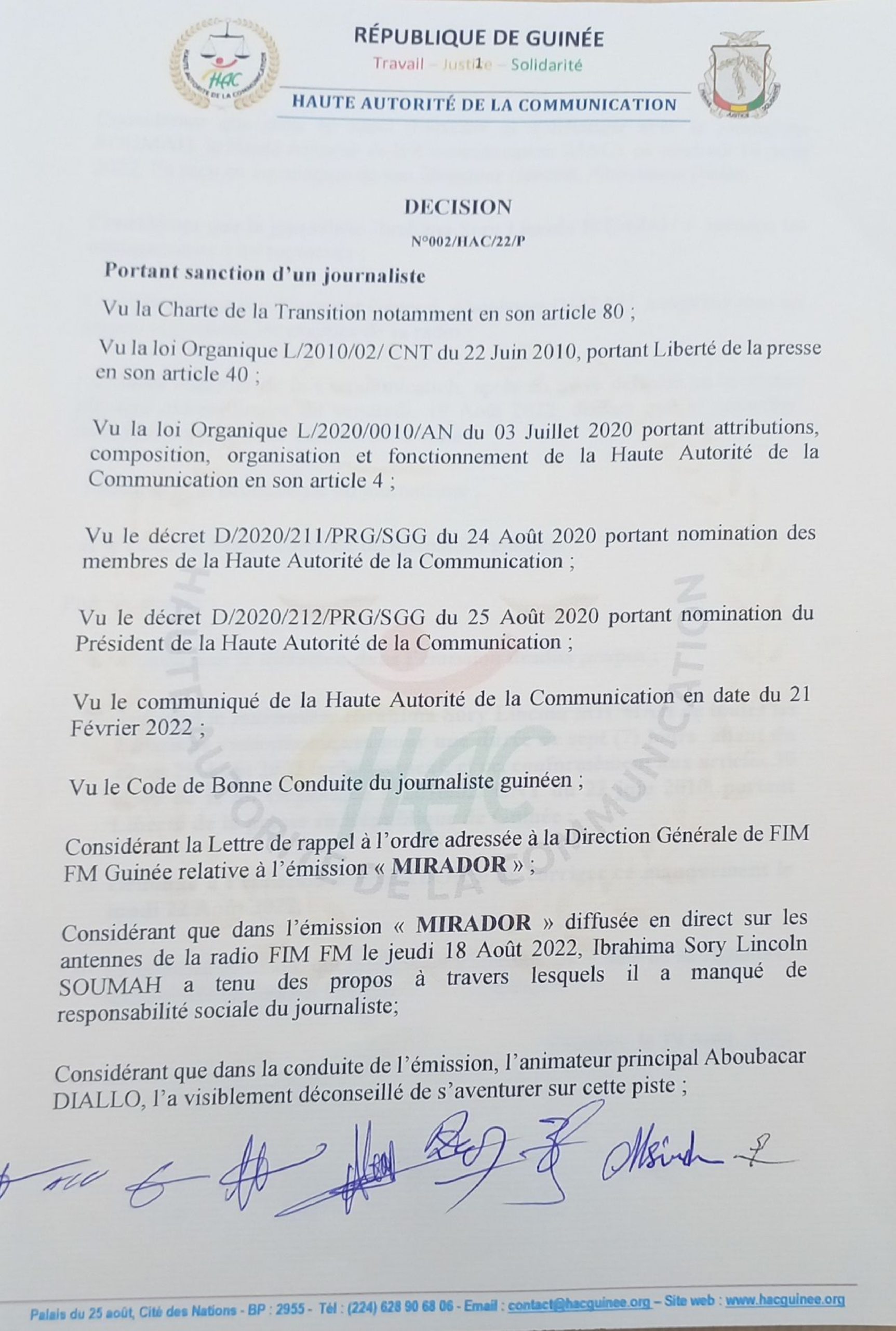 La Haute Autorité de la Communication (HAC) a suspendu vendredi le journaliste Ibrahima Lincoln Soumah [de Fim fm] de toutes les émissions radiophoniques pour une durée de sept jours allant du 22 au 29 août 2022 inclusivement. Ordonnant à l’émission « Mirador » de corriger ce manquement le lundi 22 août 2022.