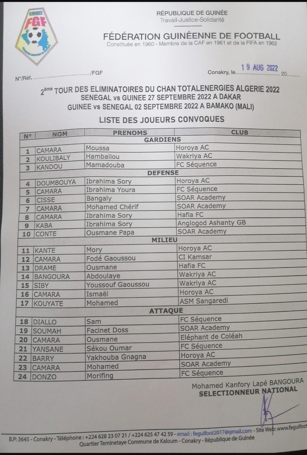 Après quelques jours de préparation avec une liste très élargie d’une quarantaine de joueurs, le sélectionneur du Syli local, Lappé Bangoura a fait sa sélection en vue de la double confrontation avec le Sénégal.