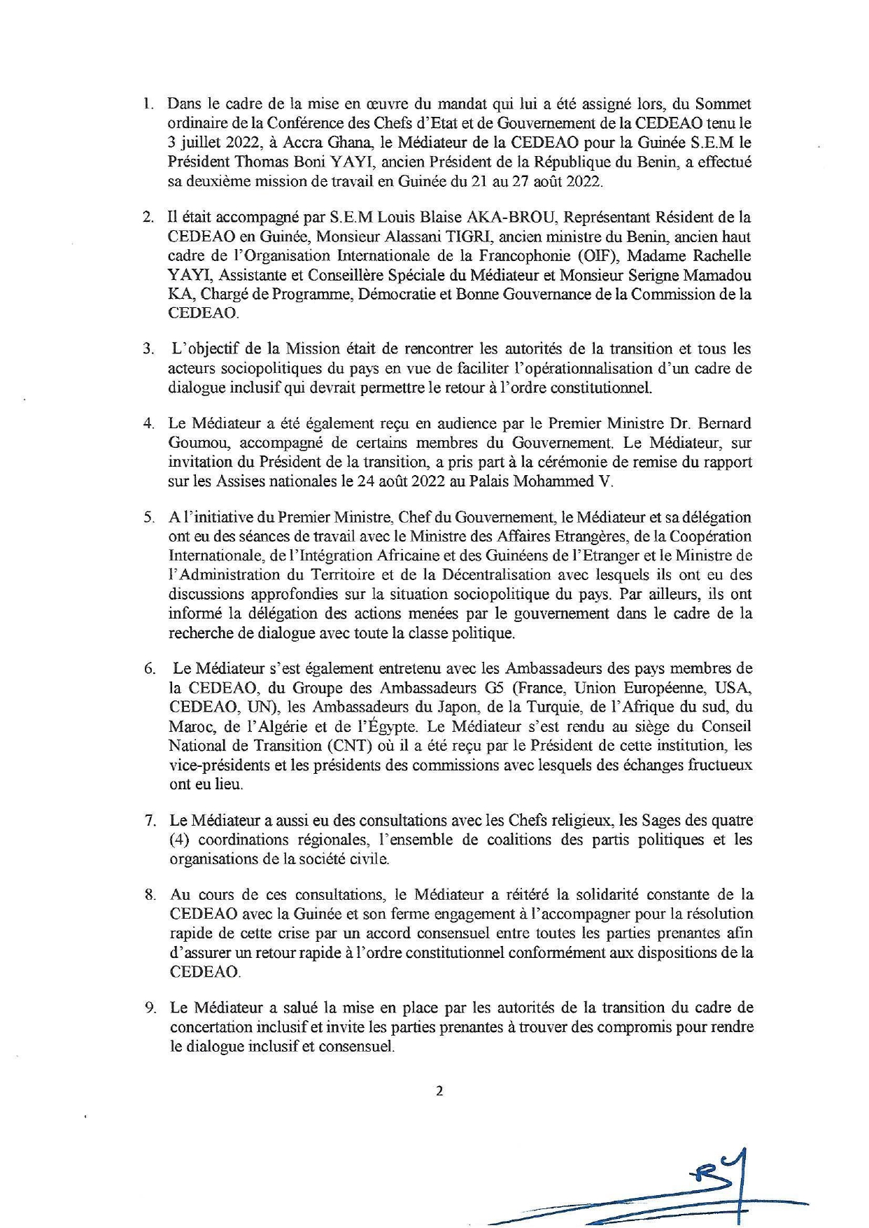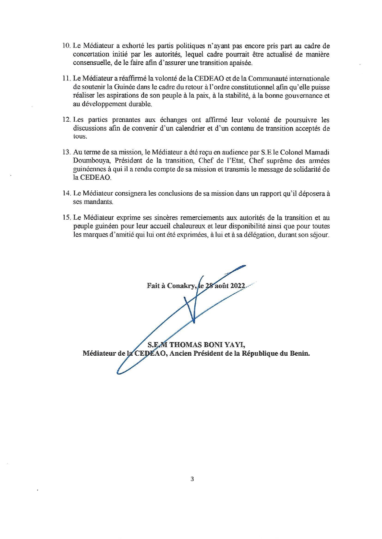 Le Médiateur de la Cedeao pour la Guinée a achevé samedi le 2è round de sa Mission en Guinée. Arrivé dimanche, 21 août dernier, Boni Yayi a, dans un communiqué rendu public, réitéré l’engagement de l’institution sous-régionale à accompagner la Guinée pour un retour rapide à l’ordre constitutionnel. Il a également exhorté les partis politiques, n’ayant pas encore paris part au cadre de dialogue initié par les autorités de le faire pour une transition apaisée. Communiqué